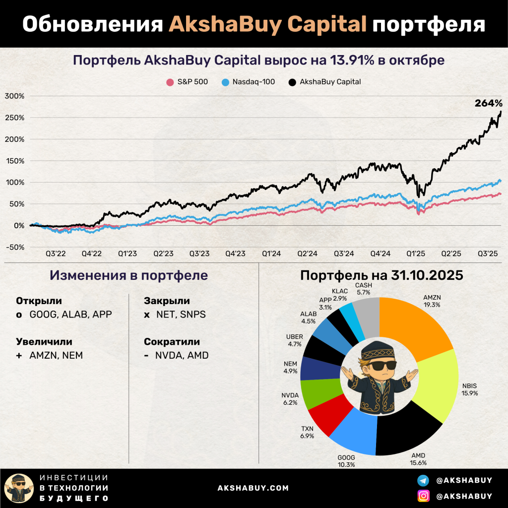 В октябре наш портфель продемонстрировал сильный результат в +13.91%. Основным драйвером роста стала наша значительная позиция в AMD ($AMD), что позволило нам достичь доходности +60% с начала года.