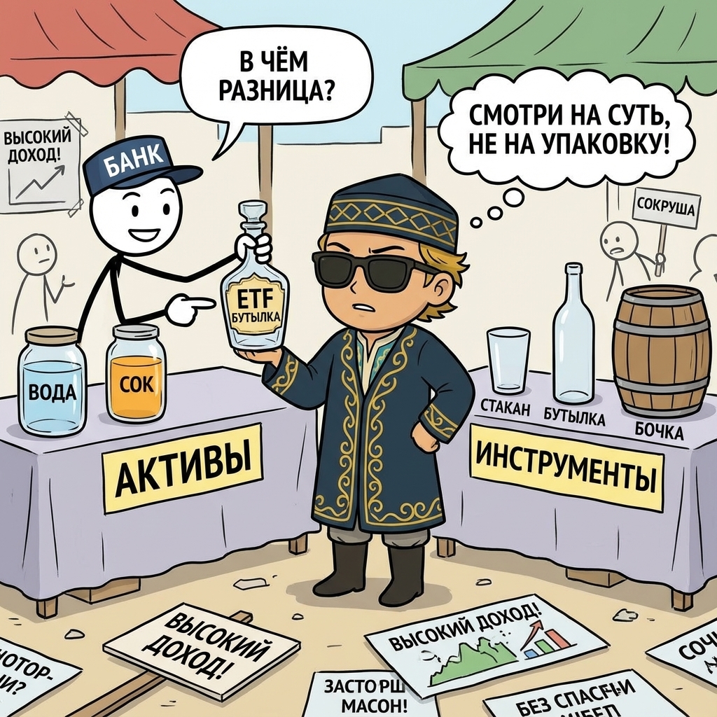 Главная цель этого модуля – научить вас видеть суть за маркетинговой шелухой. Мы проведем фундаментальную границу между классами активов (тем, чем вы по сути владеете) и инвестиционными инструментами (способами, которыми вы это покупаете). Представьте, что активы – это напиток (вода, сок или, скажем, что-то покрепче), а инструменты – это тара (стакан, бутылка или бочка). Многие новички совершают классическую ошибку: они тратят часы, выбирая самую красивую и технологичную «бутылку» (будь то модный ETF, приложение брокера или структурный продукт), совершенно забывая проверить, что налито внутри – живая вода или уксус. Мы научимся смотреть сквозь этикетку.