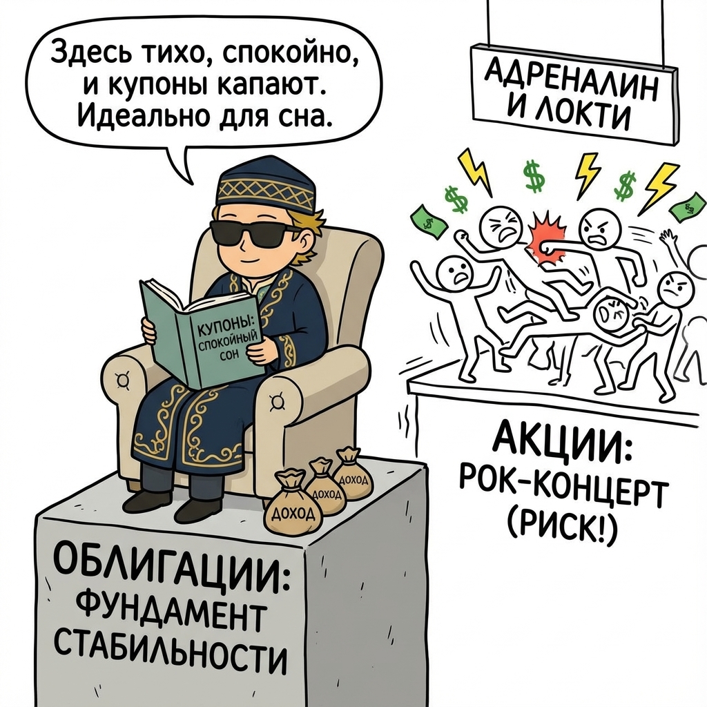 Если акции – это рок-концерт с прыжками в толпу, адреналином и риском получить локтем в челюсть (но и шансом поймать медиатор звезды), то облигации – это вечер в консерватории. Здесь никто не кричит, все сидят в удобных креслах, и вы точно знаете, когда закончится представление. После предыдущей главы про акции у вас могло сложиться впечатление, что инвестиции – это сплошные американские горки, где ваше состояние скачет, как кардиограмма испуганного зайца. Что ж, пришло время добавить в наш финансовый коктейль немного успокоительного.
